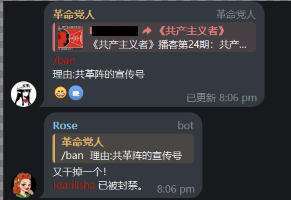 刚刚我们收到了这封无奈的来信。来信者吐槽说,自己因为在Telegram的群组“工农解放社”分享我们先前揭露“马列毛大群”的文章,被群组管理员攻击为“共革阵宣传员”进而封禁、踢出。这位同志对于其他毛左小团体对我们的敌意非常疑惑。